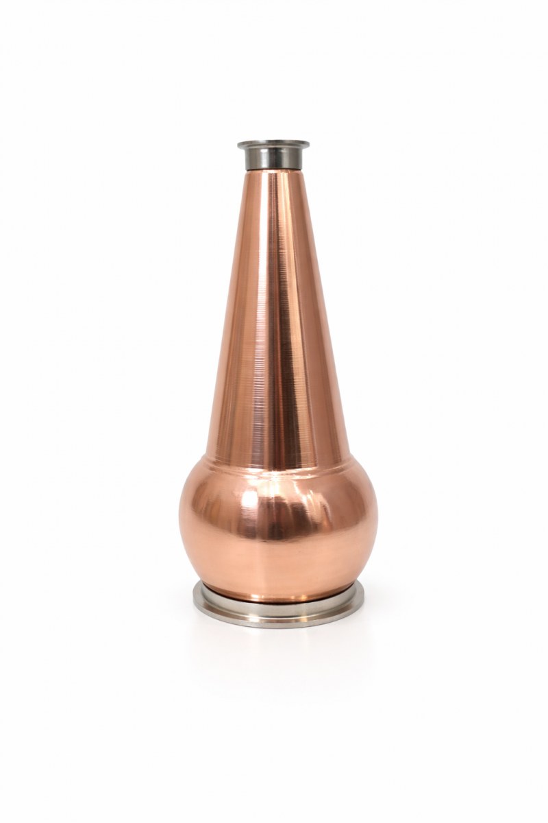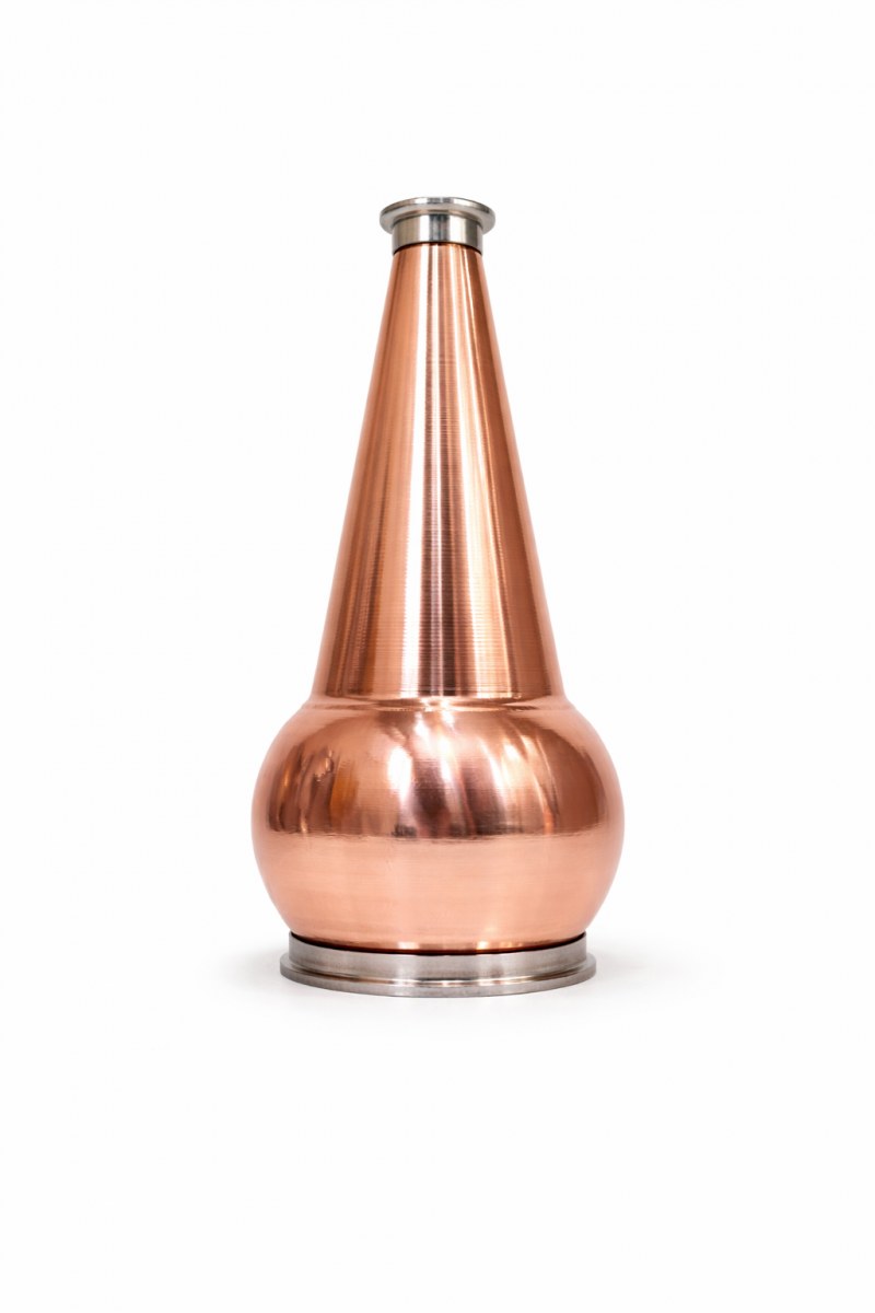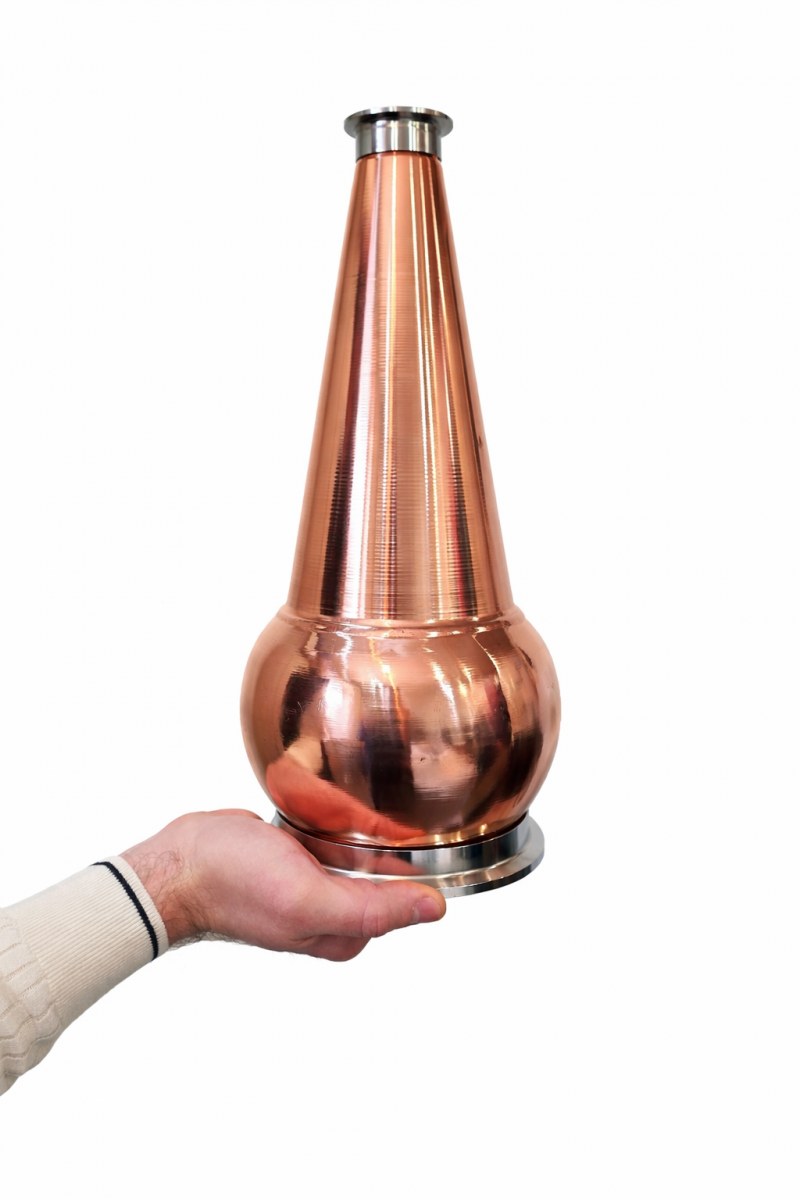Более низкокипящие спиртовые фракции попадая на стенки медного шлема конденсируются в жидкое состояние и стекают обратно в перегонный куб, повышая тем самым крепость и качество получаемого напитка.