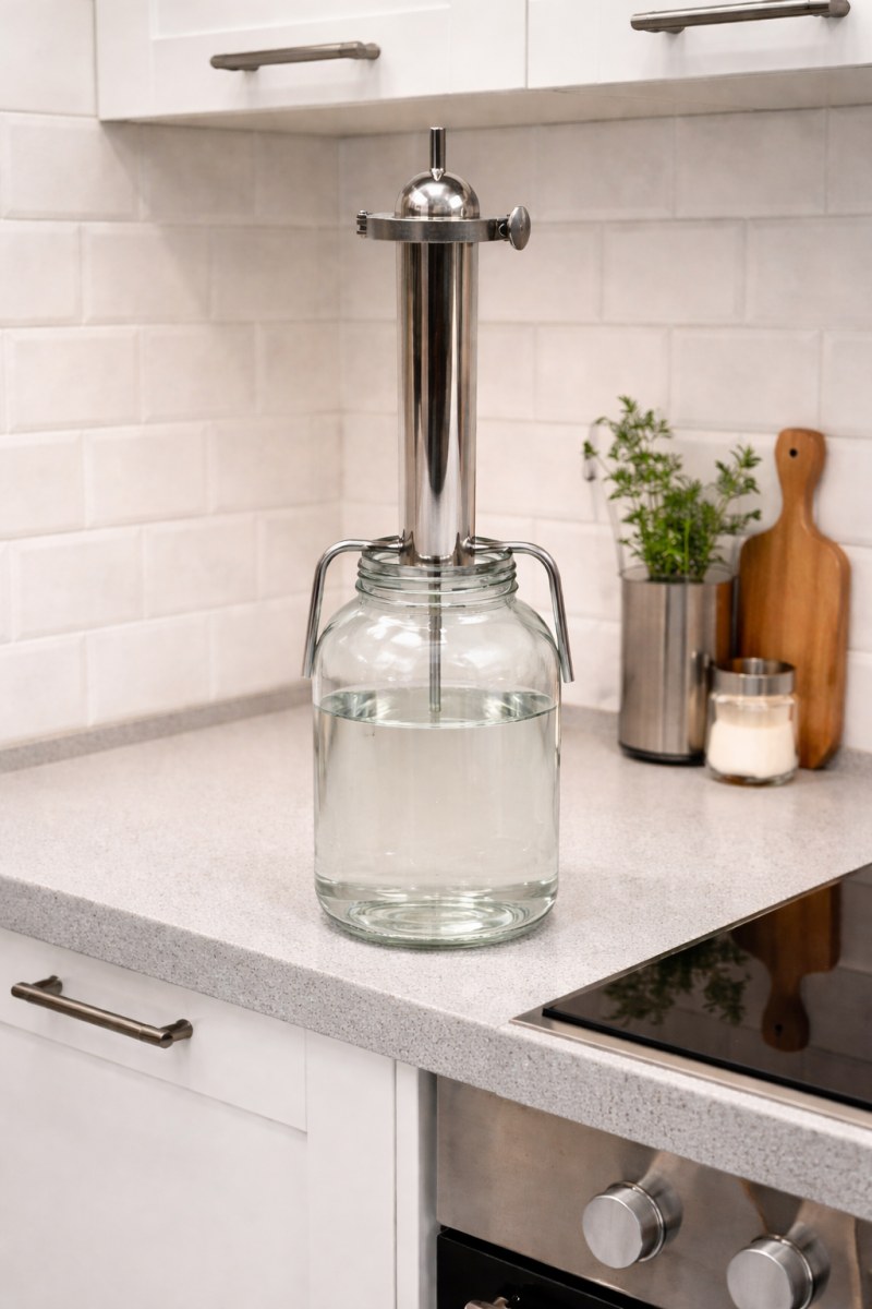 - Универсальная установка. Колонну можно разместить на столе или закрепить на стандартной 3‑литровой стеклянной банке - ножки конструкции специально адаптированы для такого монтажа.